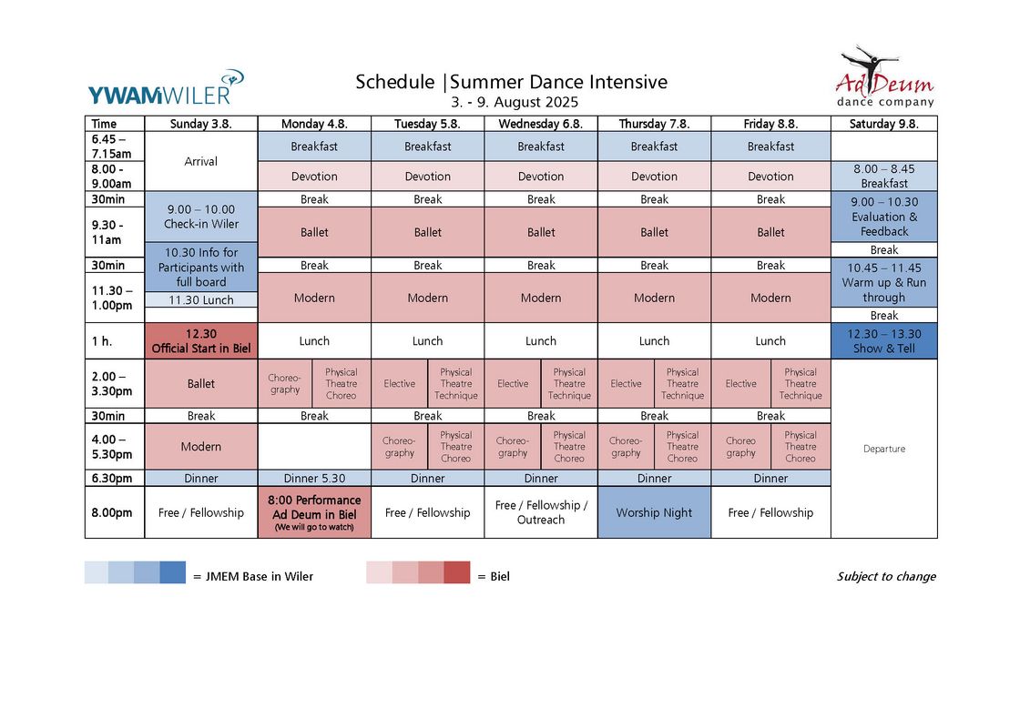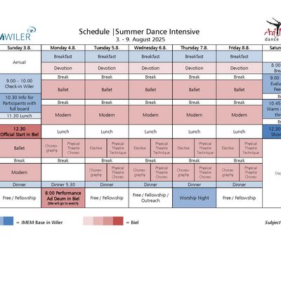 If you are not able to be part of the whole Summer Dance Intensive Seminar, you have the opportunity to attend one or more Classes without application (Sunday-Friday). The costs are CHF 25.- per class(90min). The costs have to be paid in cash(CHF) before each class to a YWAM staff member in the studio. The studios are in a 15minutes walking distance from each other. That makes a change between levels possible during the break.